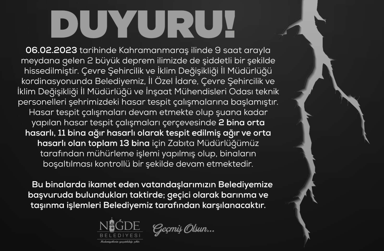 Bu binalarda ikamet eden vatandaşlarımızın Belediyemize başvuruda bulundukları taktirde geçici olarak barınma ve taşınma işlemleri Belediyemiz tarafından karşılanacaktır."