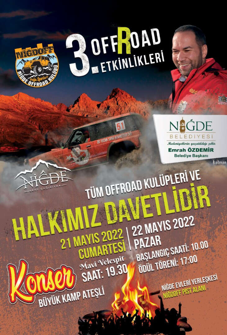 Bu yıl 3.’sü düzenlenecek olan Off-Road Yarışması için yüzlerce Off-Road tutkunu Niğde’ye gelecek. Bu etkinlik Türkiye’nin dört bir yanındaki off-road tutkunlarını Niğde’de buluşturacak.