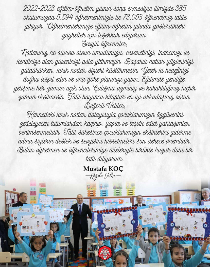 Niğde valisi Mustafa Koç, Niğde Asım Zeynep Ecemiş ilkokulunda gerçekleştirilen karne dağıtım törenine katıldı. Öğrencilerin karne heyecanına ortak olan vali Koç, çocuklara karnelerini dağıttı. Niğde valisi Mustafa Koç sosyal medya hesabı üzerinden yayımladığı yazılı mesajda şu ifadelere yer verdi; “2022-2023 eğitim-öğretim yılının sona ermesiyle ilimizde 385 okulumuzda 5.594 öğretmenimizle ile 73.053 öğrencimiz tatile giriyor. Öğretmenlerimize eğitim-öğretim yılında gösterdikleri gayretler için teşekkür ediyorum. Sevgili öğrenciler, notlarınız ne olursa olsun umudunuzu, cesaretinizi, inancınızı ve kendinize olan güveninizi asla yitirmeyin. Başarılı notlar yüzlerinizi güldürürken, kirik notlar sizleri küstürmesin. Yeter ki hedefinizi doğru tespit edin ve ona göre planınızı yapın. Eğitimde yeniliğe gelişime her zaman açık olun. Çalışma azminiz ve kararlılığınız hiçbir zaman eksilmesin. Tatil boyunca kitaplar en iyi arkadaşınız olsun. Değerli Veliler karnedeki kirik notlar dolayısıyla çocuklarımızın özgüvenini zedeleyecek tutumlardan kaçınıp, yapıcı ve teşvik edici yaklaşımlar benimsenmelidir. Tatil süresince çocuklarımızın eksiklerini giderme adına sizlerin destek ve sevgisini hissetmeleri son derece önemlidir. Bütün öğretmen ve öğrencilerimize aileleriyle birlikte huzur dolu bir tatil diliyorum.” dedi.