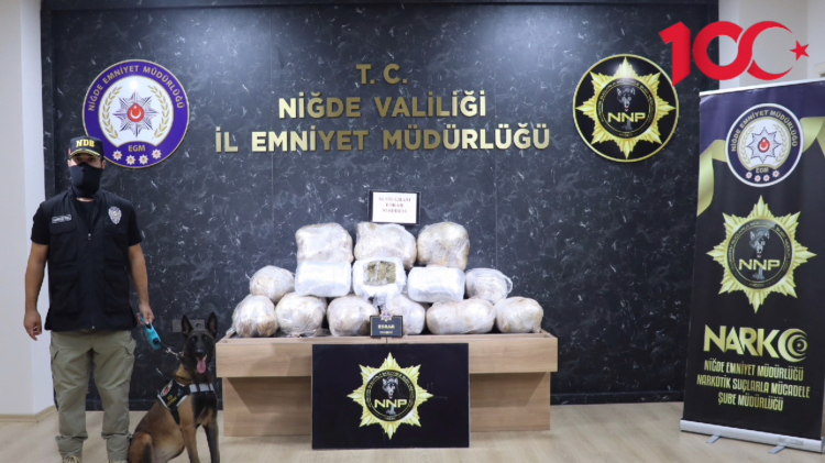 Uyuşturucunun arzı ile mücadele kapsamında yürütülen çalışmalarda Niğde İl Emniyet Müdürlüğü Narkotik Suçlarla Mücadele Şube Müdürlüğü ekiplerince 26 Temmuz 2024 tarihinde gerçekleştirilen operasyonda operasyon bir TIR’da yapılan aramada; 23 Paket halinde toplam 86 kilo 950 gram esrar maddesi ele geçirildi. Olayla ilgili 1 şüpheli şahıs gözaltına alındı.