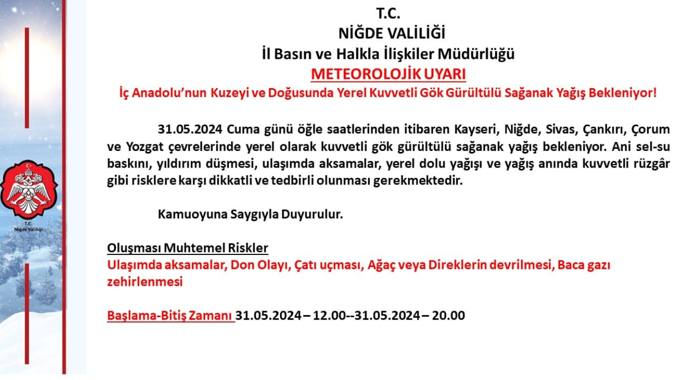 Niğde Valiliği tarafından yapılan açıklamada: ''31.05.2024 Cuma günü öğle saatlerinden itibaren Kayseri, Niğde, Sivas, Çankırı, Çorum ve Yozgat çevrelerinde yerel olarak kuvvetli gök gürültülü sağanak yağış bekleniyor. Ani sel-su baskını, yıldırım düşmesi, ulaşımda aksamalar, yerel dolu yağışı ve yağış anında kuvvetli rüzgar gibi risklere karşı dikkatli ve tedbirli olunması gerekmektedir.'' ifadeleri kullanıldı.