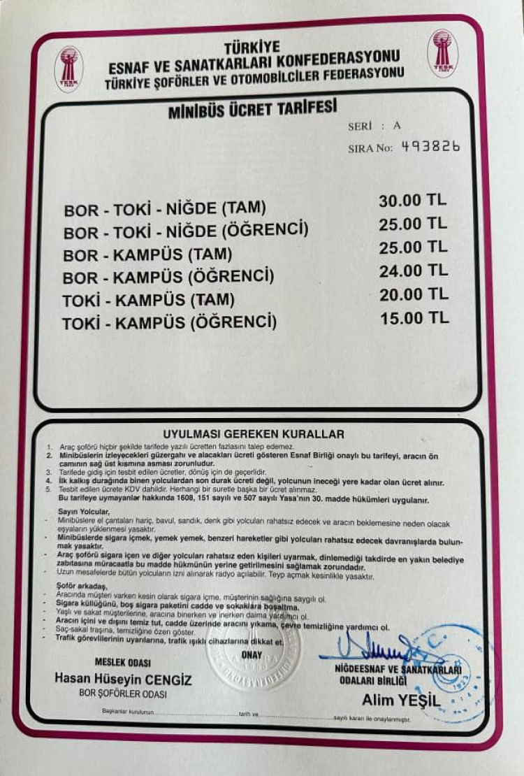 Niğde-Bor minibüs ücretlerine zam geldi.. Zamlı tarife bugünden itibaren uygulanmaya başlandı. Yeni zamlı tarifeye göre ücretler şöyle: Bor - TOKİ - Niğde arası tam yolcu ücreti 30 TL, Bor - TOKİ - Niğde arası öğrenci ücreti 25 TL, Bor - Kampüs tam yolcu ücreti 25 TL, Bor - Kampüs arası öğrenci ücreti 24 TL, TOKİ - Kampüs arası tam yolcu ücreti 20 TL ve TOKİ - Kampüs arası öğrenci ücreti ise 15 TL.