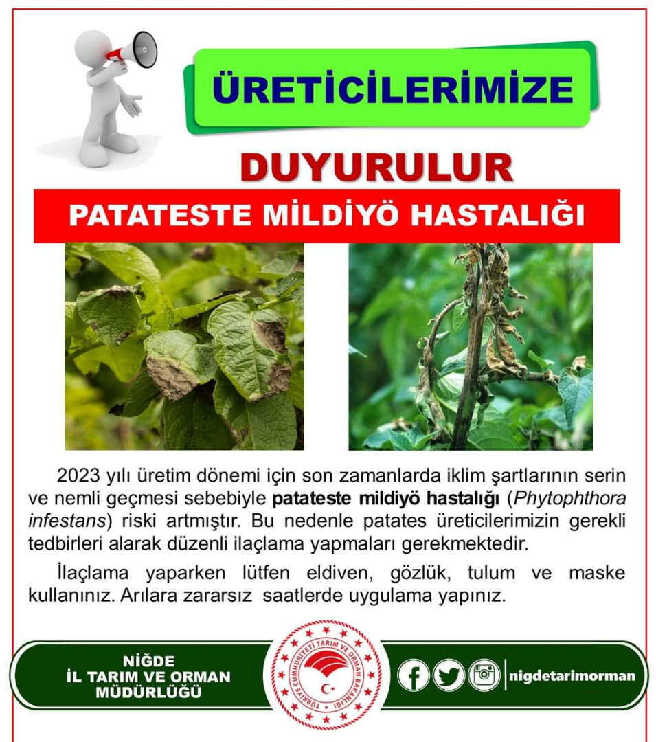 Niğde İl Tarım ve Orman Müdürlüğü sosyal medya hesabı üzerinden yaptığı açıklamada ; "2023 yılı üretim dönemi için son zamanlarda iklim şartlarının serin ve nemli geçmesi sebebiyle patateste mildiyö hastalığı (Phytophthora infestans) riski artmıştır. Bu nedenle patates üreticilerimizin gerekli tedbirleri alarak düzenli ilaçlama yapmaları gerekmektedir.