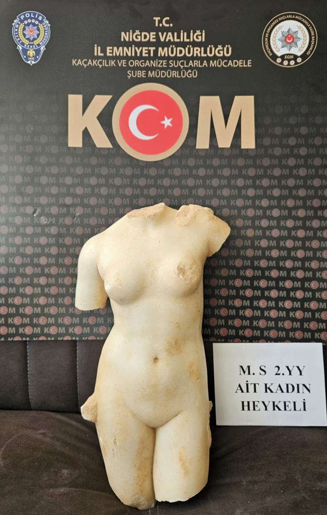 Kültürel değerlerimizin ve tarihi mirasımızın korunmasına ve tarihi eserlerin yasadışı ticaretinin önlenmesine yönelik yürütülen çalışmalarda, Niğde İl Emniyet Müdürlüğü KOM Şube Müdürlüğünce 22 Şubat 2023 günü yapılan operasyonda; Roma dönemine ait 1 adet heykel ele geçirildi, 1 şahsa 2863 Sayılı Kültür ve Tabiat Varlıklarını Koruma Kanununa Muhalefet Suçu kapsamında gerekli adli işlemler yapılmış olup tarihi eser Müze Müdürlüğüne teslim edildi.
