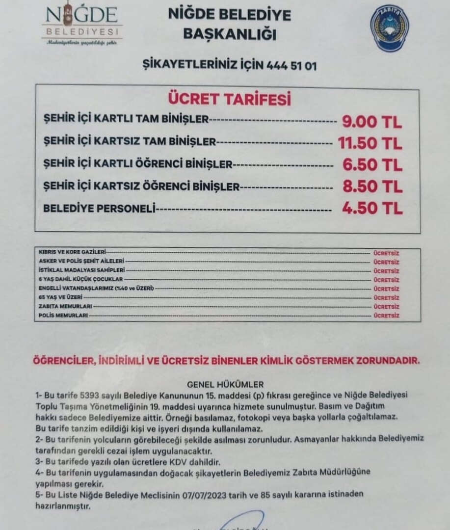 Buna göre alınan yeni kararla şehir içi kartlı tam binişler 9 lira, şehir içi kartsız tam binişler 11,50 lira, şehir içi kartlı öğrenci binişler 6,50 lira, şehir içi kartsız öğrenci binişler 8,50 lira ve belediye personeli 4,50 lira olarak güncellendi.