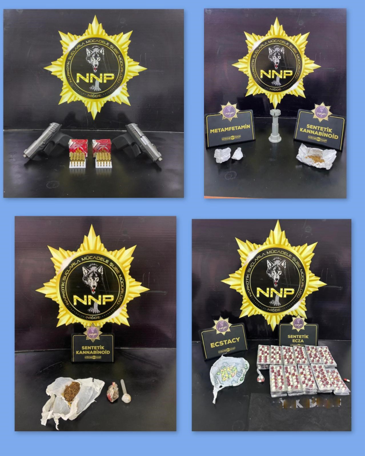 27,83 gram Sentetik Kannabinoid maddesi, 588 adet Sentetik Ecza maddesi, 1,24 gram Metamfetamin maddesi, 32 adet Ectasy maddesi, 1 adet uyuşturucu kullanım aparatı, 2 adet 7.65 çapında ruhsatsız tabanca ve tabancalara ait 2 adet şarjör ve 50 adet 7.65 çapında mermi ele geçirildi.