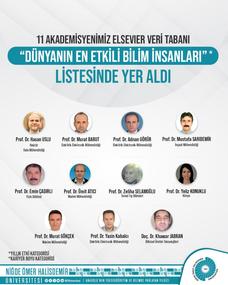 2023 yılı verilerinin esas alınarak yapılan sıralamaya göre Niğde Ömer Halisdemir Üniversitesi'nden Rektör Prof. Dr. Hasan Uslu ile birlikte Prof. Dr. Murat Barut, Prof. Dr. Adnan Görür, Prof. Dr. Mustafa Sarıdemir, Prof. Dr. Ümit Atıcı, Prof. Dr. Emin Çadırlı, Prof. Dr. Yasin Kabalcı, Prof. Dr. Murat Gökçek, Prof. Dr. Yeliz Konuklu, Prof. Dr. Zeliha Selamoğlu ve Doç. Dr. Khawar Jabran girmeyi başardı. Böylece 11 akademisyenimiz, her iki kategoride “Dünyanın Etkili Bilim İnsanları Listesi”ne adını yazdırdı.