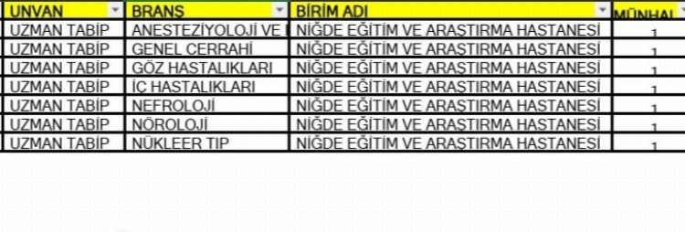 Niğde Ömer Halisdemir Üniversitesi Eğitim ve Araştırma Hastanesine; 1 Nefroloji Uzmanı, 1 Göz Hastalıkları Uzmanı, 1 Nöroloji Uzmanı, 1 Genel Cerrahi Uzmanı, 1 İç Hastalıkları Uzmanı, 1 Nükleer Tıp Uzmanı, 1 Anesteziyoloji Uzmanı açıldı.