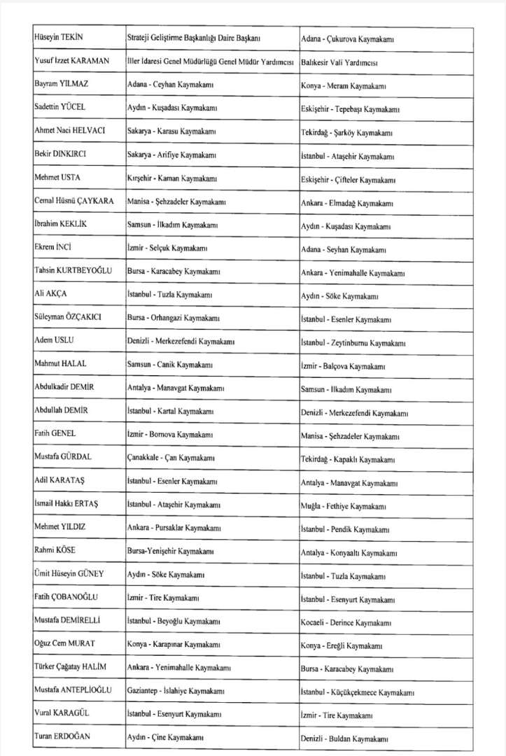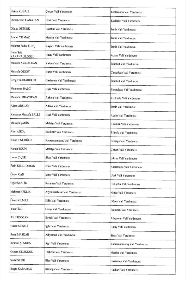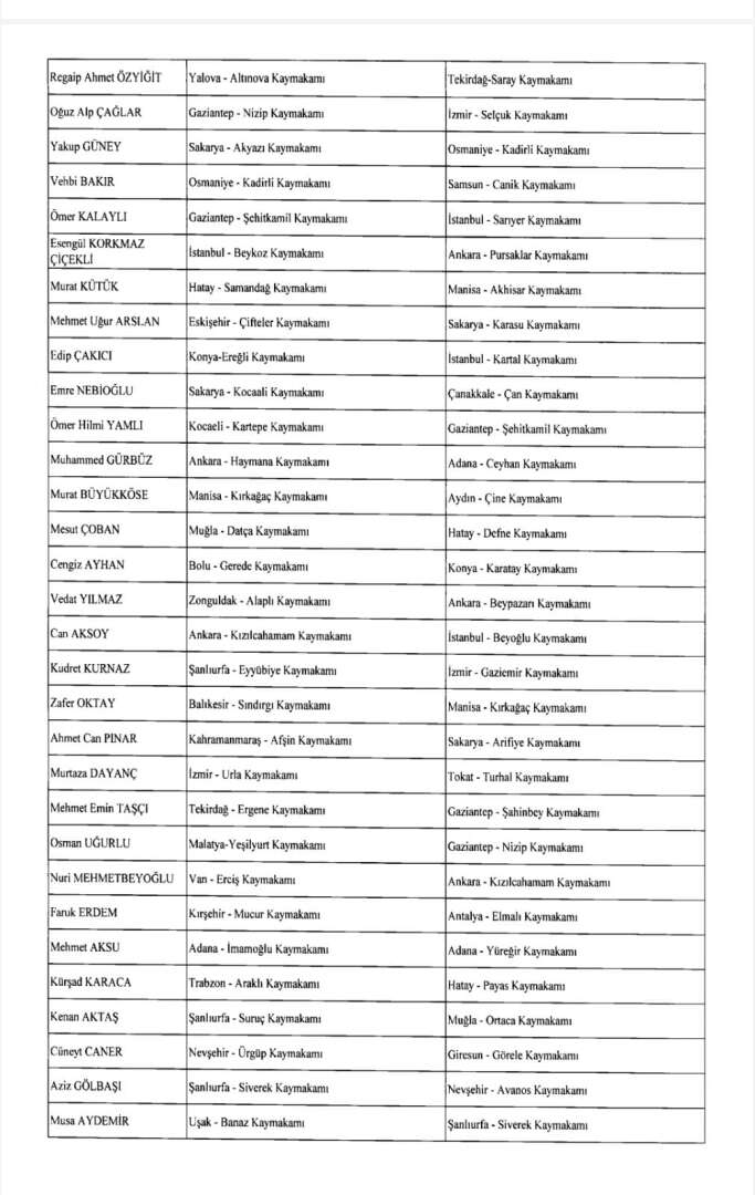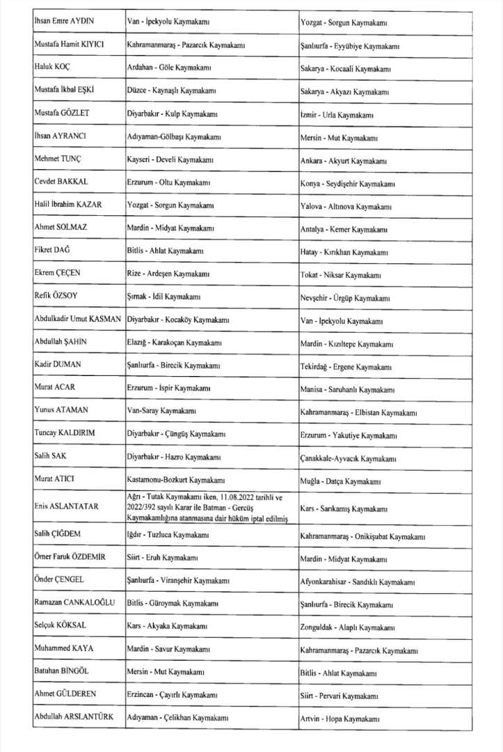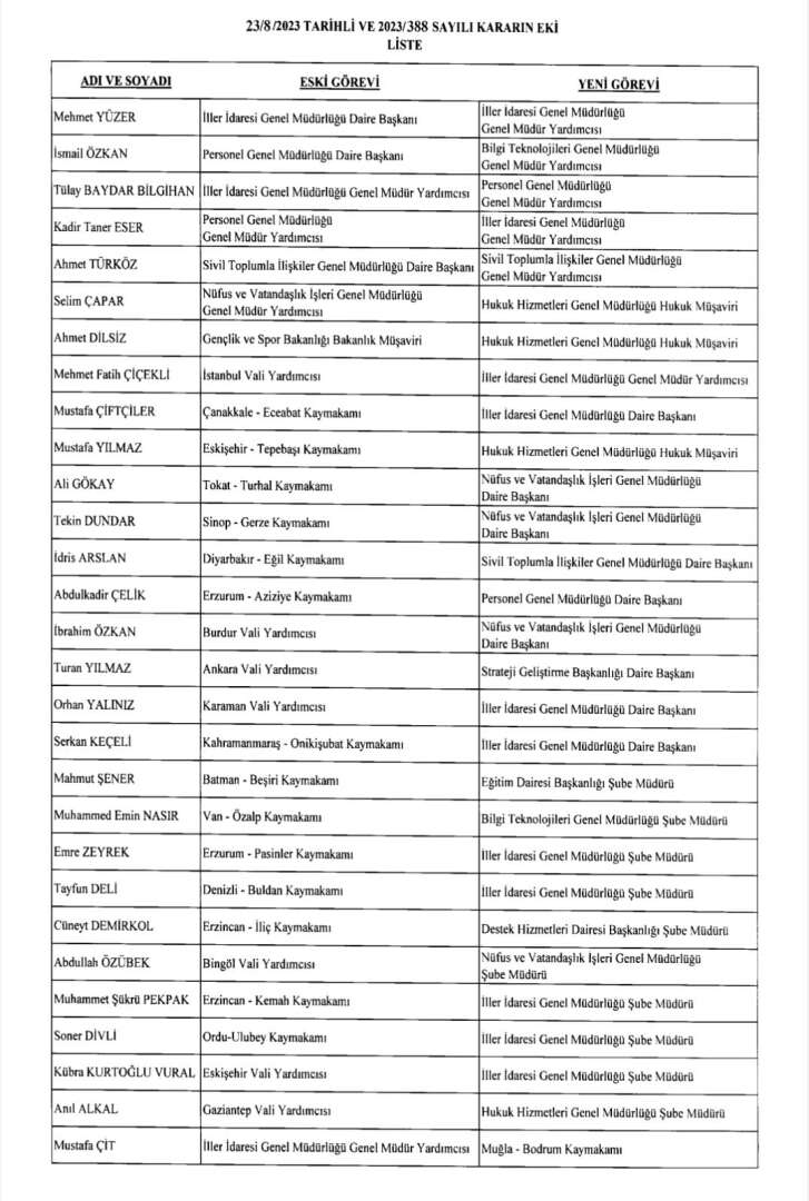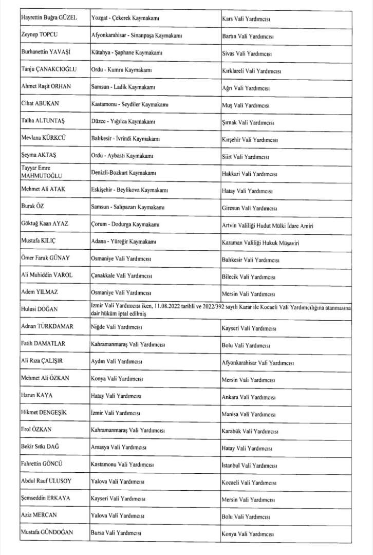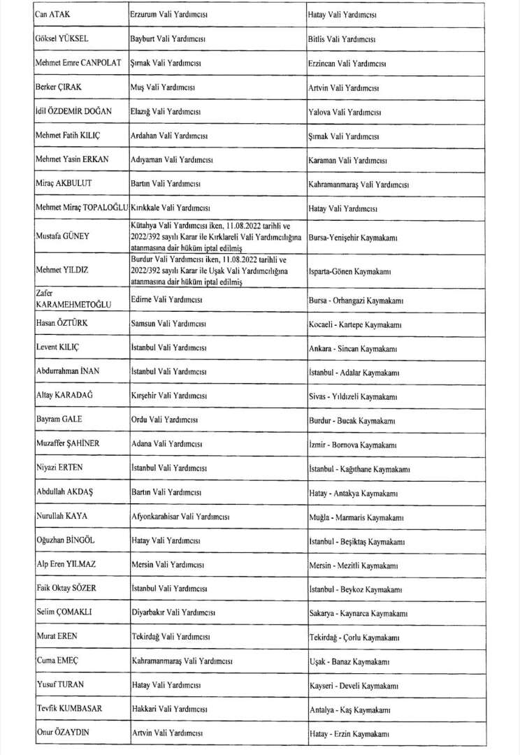 Cumhurbaşkanı Erdoğan’ın imzasıyla 24 Ağustos gece yarısı yayımlanan atama kararıyla yüzlerce kaymakam, vali yardımcısı ve bürokratın görev yeri değişti; 42 ile yeni jandarma komutanı atandı.
