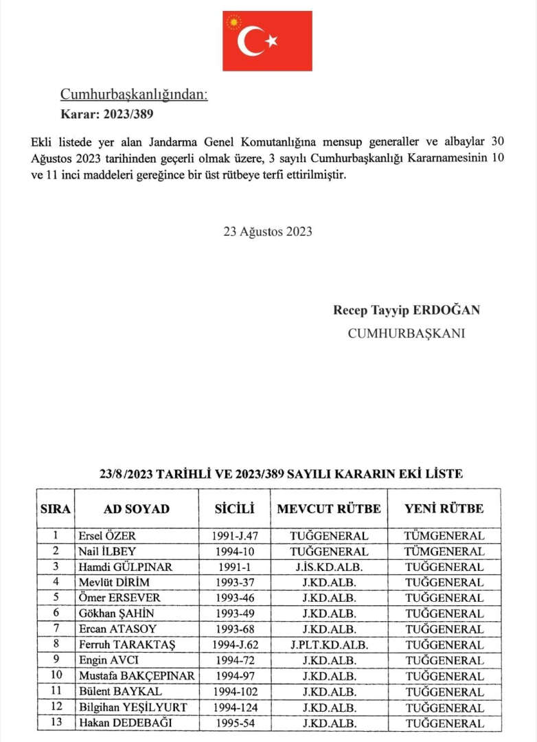 Resmi Gazete’de yayımlanan Cumhurbaşkanı kararına göre, 42 ilin jandarma komutanlıklarına atamalar yapılırken, Jandarma Genel Komutanlığı'ndaki 2 Tuğgeneral, Tümgeneralliğe, 11 kıdemli albay ise Tuğgeneralliğe terfi etti.