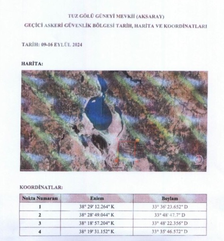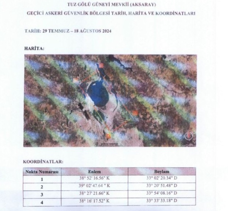 Tuz Gölü güneyinde, 29 Temmuz-18 Ağustos 2024 tarihlerinde "geçici askeri güvenlik bölgesi" ilan edildiği bildirildi.