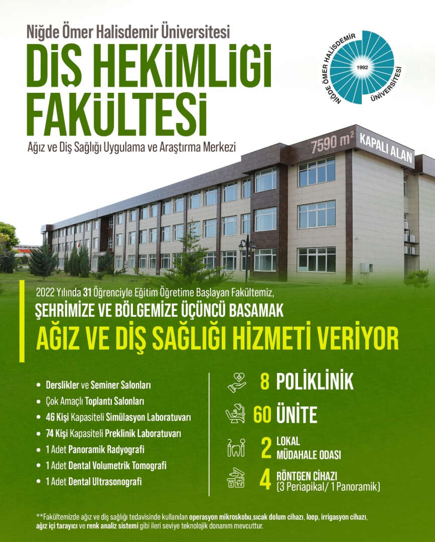 8 poliklinik, 60 ünite, 2 lokal müdahale odası, 4 röntgen cihazı ile hizmete başlayan NÖHÜ Diş Hekimliği Fakültesi 3. basamak yani; kendi alanında uzmanlaşmış kişilerin bulunduğu ve ileri teknolojilerin kullanıldığı sağlık kurumu olarak faaliyet gösterecek.