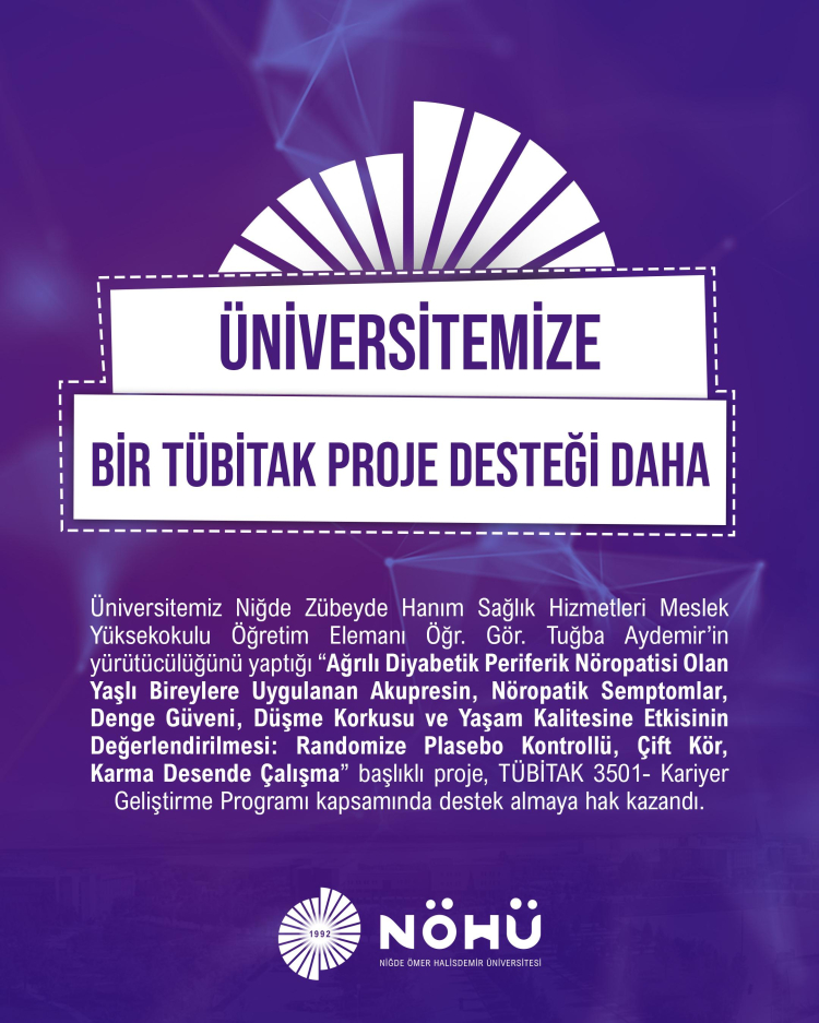 NÖHÜ Zübeyde Hanım Sağlık Hizmetleri Meslek Yüksekokulu Öğretim Elemanı Öğr. Gör. Tuğba Aydemir’in yürütücülüğünü yaptığı “Ağrılı Diyabetik Periferik Nöropatisi Olan Yaşlı Bireylere Uygulanan Akupresin, Nöropatik Semptomlar, Denge Güveni, Düşme Korkusu ve Yaşam Kalitesine Etkisinin Değerlendirilmesi: Randomize Plasebo Kontrollü, Çift Kör, Karma Desende Çalışma” başlıklı proje, TÜBİTAK 3501- Kariyer Geliştirme Programı kapsamında destek almaya hak kazandı.