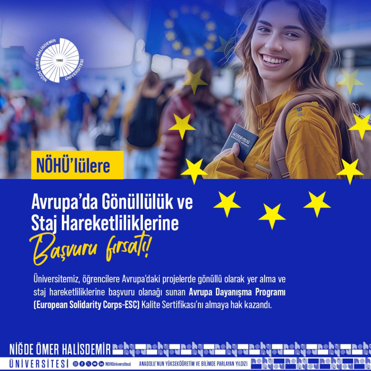 Programın kriterlerini karşılayarak Türkiye’de European Solidarity Corps (ESC) Kalite Sertifikası (ESC50-QLA) almaya hak kazanan sayılı yükseköğretim kurumu arasında yer alan Niğde Ömer Halisdemir Üniversitesi, bu sayede öğrencilerine Avrupa’da akademik ve mesleki gelişim olanaklarıyla birlikte kültürel deneyim ve kültürlerarası etkileşim fırsatı da sunacak. Ayrıca öğrenciler Avrupa Gençlik Portalı (programmes.eurodesk.eu) üzerinden ilgili ülkelerdeki gönüllülük ve staj hareketlerine başvuru yapabilecek ve yeni sosyal ağlar kurma şansı da yakalayacak.