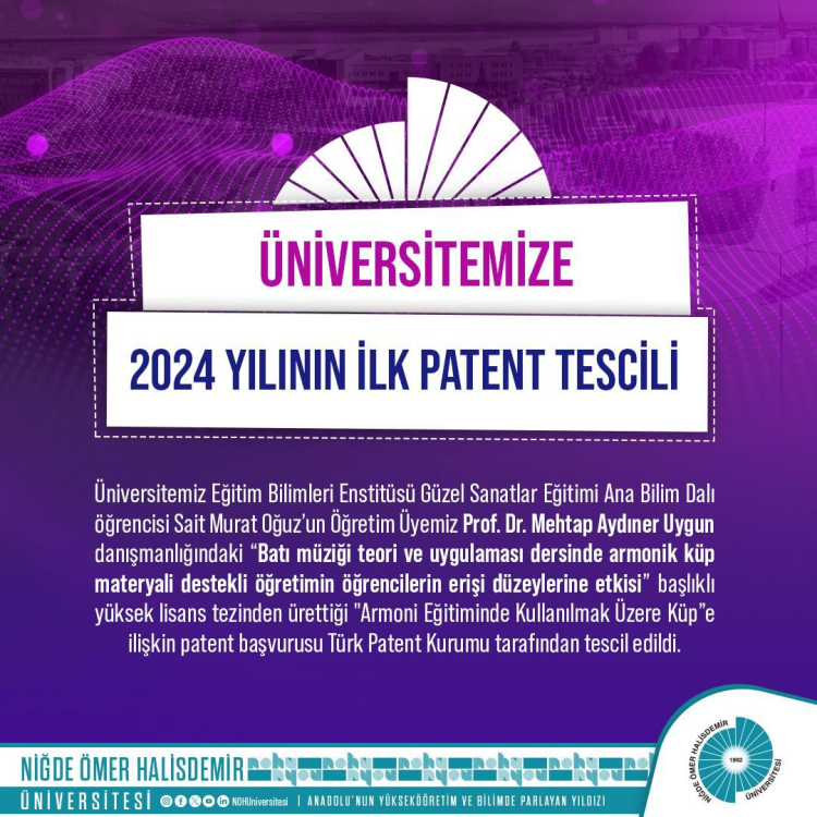 Niğde Ömer Halisdemir Üniversitesi “Fikri ve Sınai Haklar” alanı ile ilgili son yıllarda gerçekleştirdiği yoğun çalışmalar sonucunda patent ve faydalı modellerle ilgili başarılı sonuçlar elde ediyor. Bu kapsamda Teknoloji Transfer Ofisi’miz (TTO) aracılığıyla 30 Kasım 2022 tarihinde Türk Patent Kurumu’na başvurusu yapılan Niğde Ömer Halisdemir Üniversitesi Eğitim Bilimleri Enstitüsü Güzel Sanatlar Eğitimi Ana Bilim Dalı Müzik Eğitimi Bilim Dalı öğrencisi Sait Murat Oğuz’un Öğretim Üyesi Prof. Dr. Mehtap Aydıner Uygun danışmanlığında tamamlamış olduğu “Batı müziği teori ve uygulaması dersinde armonik küp materyali destekli öğretimin öğrencilerin erişi düzeylerine etkisi” başlıklı yüksek lisans tezinden ürettiği "Armoni Eğitiminde Kullanılmak Üzere Küp”e ilişkin patent başvurusu Türk Patent Kurumu tarafından 30 Nisan 2024 tarihinde tescil edildi.