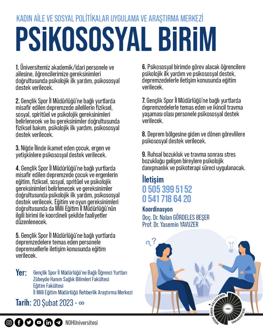 Kadın Aile ve Sosyal Politikalar Uygulama ve Araştırma Merkezi Psikososyal Birimi tarafından, Niğde Ömer Halisdemir Üniversitesinde görevli akademik, idari personel ve ailesine, öğrencilere, KYK yurtlarında misafir edilen depremzedelere, Niğde'de ikamet eden çocuk ve yetişkinlere destek verilecek.