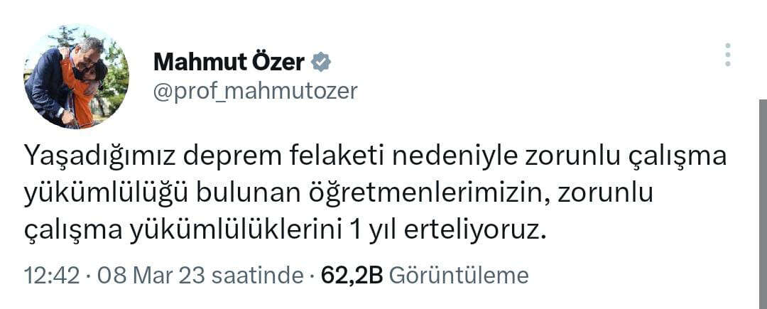 Bakan Özer sosyal medya hesabından yaptığı paylaşımla deprem nedeniyle öğretmenlerin zorunlu çalışma yükümlülüğünün 1 yıl ertelendiğini duyurdu.