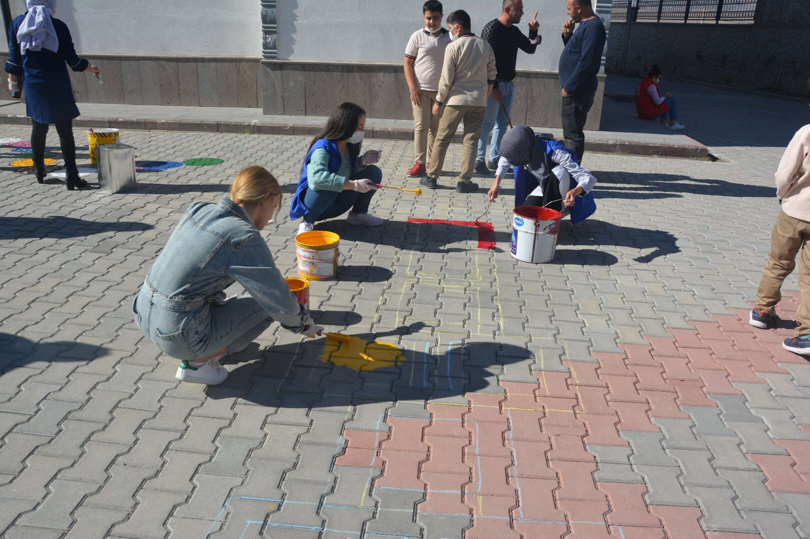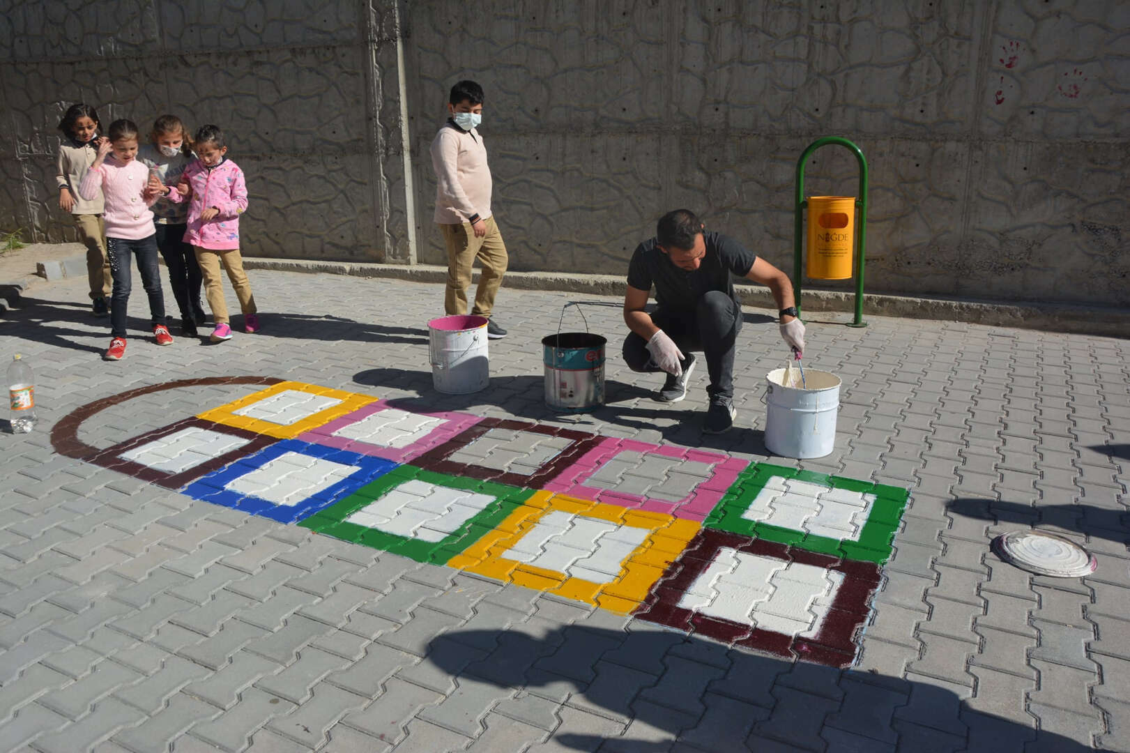 Okul bahçesi boyama etkinliği ile çocuklara özel olarak şekiller yapılıyor.