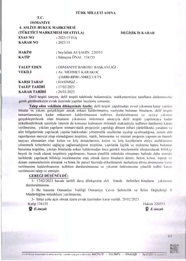 Bu karar binaları hasarlı olan vatandaşların ilerde açacakları malkaybı davalarında delil olmak üzere binalardan alınacak numunelerin delil olarak kullanılması için büyük önem taşıyor.
