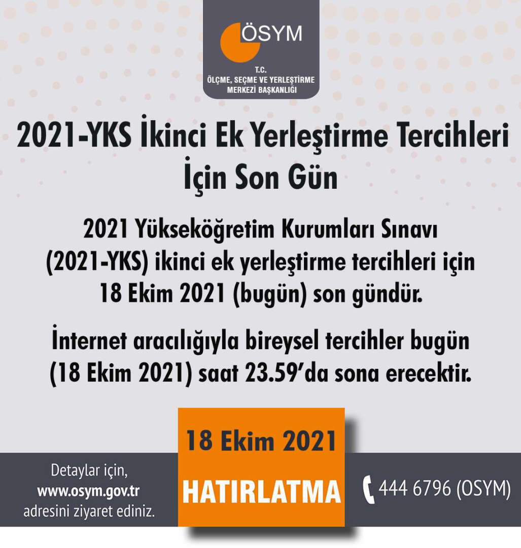 ÖSYM'nin sosyal medya hesaplarından yapılan paylaşımda, 2021 YKS ikinci ek yerleştirme tercihleri için 18 Ekim 2021'in (bugün) son gün olduğu belirtildi. Açıklamada, internet aracılığıyla yapılacak tercihlerin bugün saat 23.59'da sona ereceği kaydedildi.