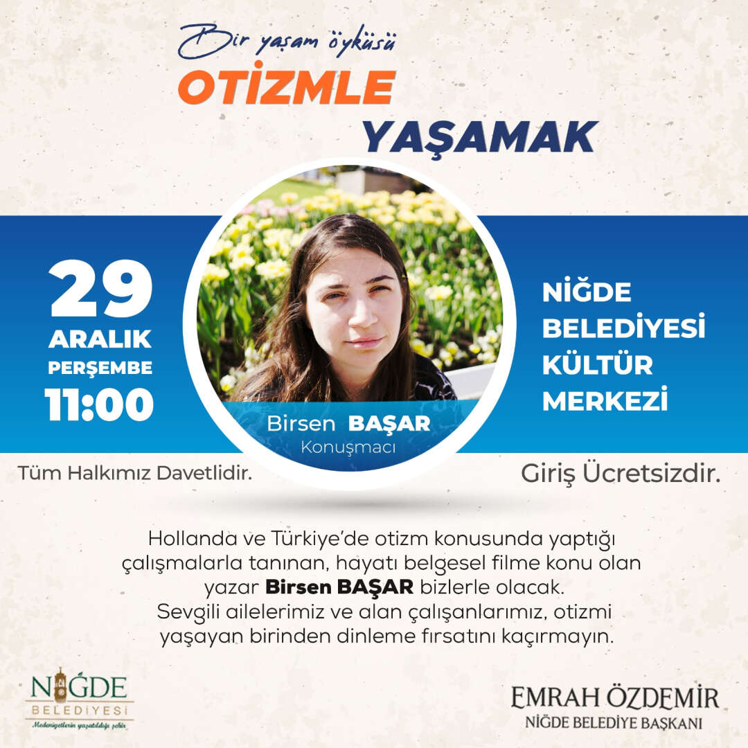 Konuyla ilgili bir açıklama yapan Niğde Belediye Başkanı Emrah Özdemir; “Niğde Belediyesi olarak halkımızı her konuda bilgilendirmeye çalışıyoruz, bu minvalde çeşitli konferanslar ve söyleşilerle faaliyetlerimiz devam ediyor. 29 Aralık Perşembe günü yazar Birsen Başar tarafından verilecek olan “otizmle yaşamak” isimli konferansımıza tüm vatandaşlarımızı davet ediyorum. Sevgili ailelerimiz ve alan çalışanlarımız otizmi yaşayan birinden bu konferansı dinleme fırsatını kaçırmasınlar. “dedi.