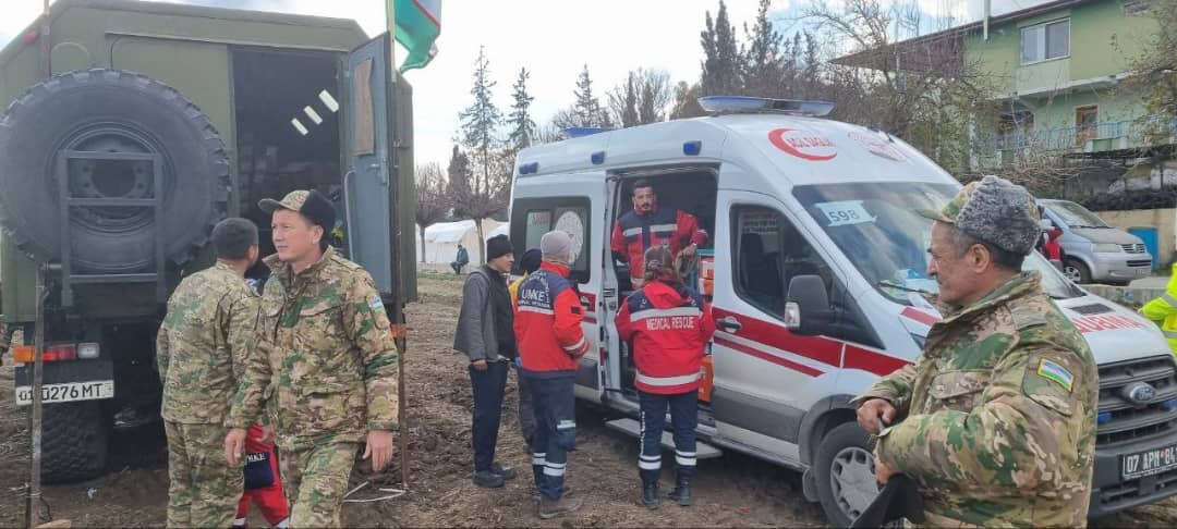 Özbekistan Cumhuriyeti Acil Durumlar Bakanlığından 100 kurtarma personeli, Özbekistan Cumhuriyeti Savunma Bakanlığından 50 askeri doktor ve 21 kurtarma ekibi ile 10 kurtarma köpeği deprem bölgesinde arama kurtarma çalışmalarında görev alıyor.