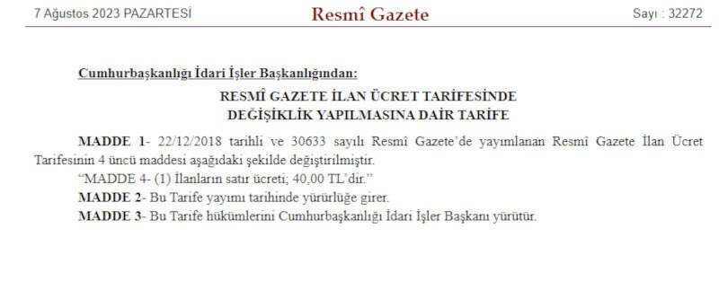 Cumhurbaşkanlığı İdari İşler Başkanlığı'nın yayımladığı yeni tarifeye göre, ilanların satır ücreti 40 lira olarak belirlendi. En son 29 Ocak 2022’de yapılan tarife değişikliği ile, ilanların satır ücreti 17 liradan 25 lira 50 kuruşa yükseltilmişti.