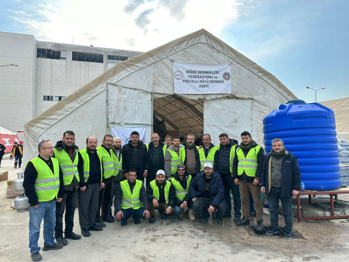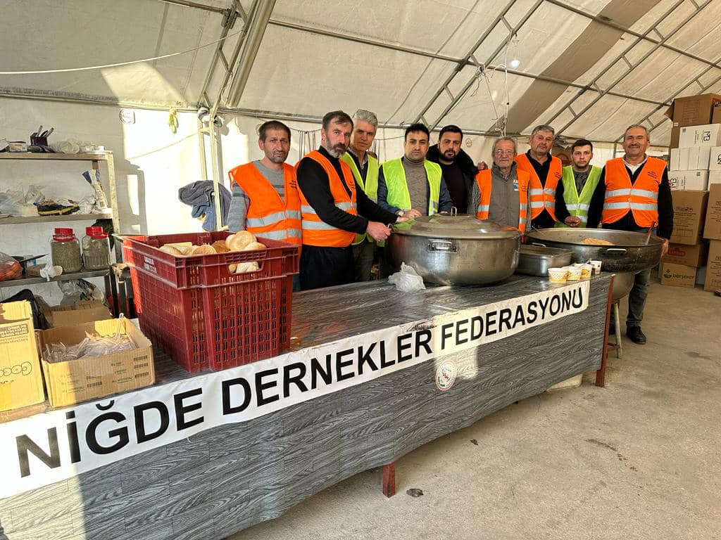 Niğde Dernekler Federasyonu tarafından kurulan yardım çadırı hem depremzedeler hem de görevlilere yönelik yemek, gıda, barınma yardımları yapılıyor.