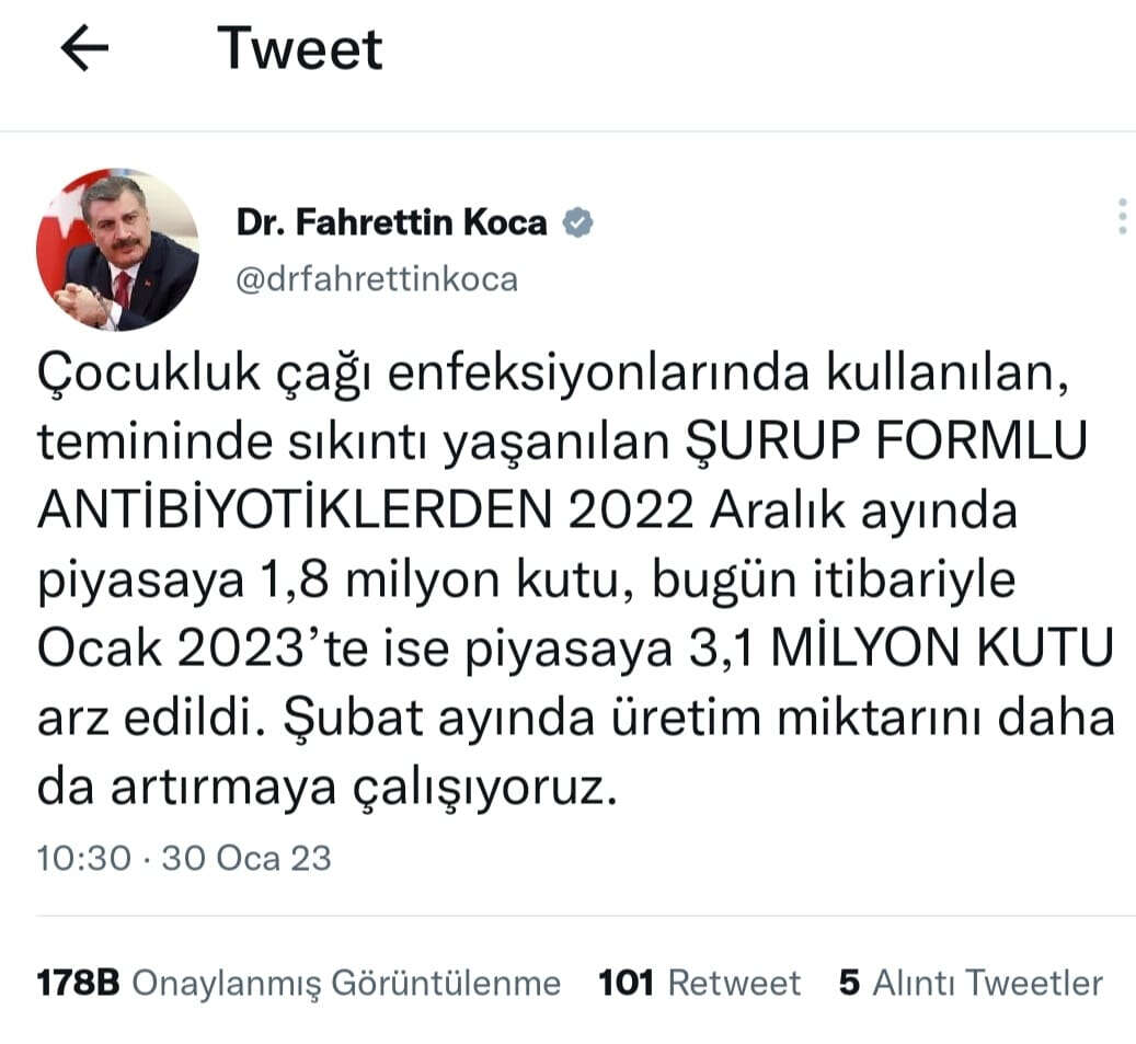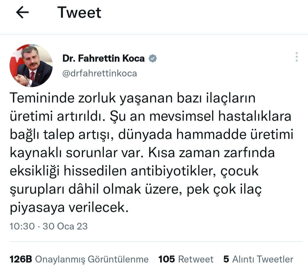 Koca'nın Twitter hesabından yaptığı açıklamada, "Temininde zorluk yaşanan bazı ilaçların üretimi artırıldı. Şu an mevsimsel hastalıklara bağlı talep artışı, dünyada hammadde üretimi kaynaklı sorunlar var. Kısa zaman zarfında eksikliği hissedilen antibiyotikler, çocuk şurupları dâhil olmak üzere, pek çok ilaç piyasaya verilecek." ifadeleri yer aldı.