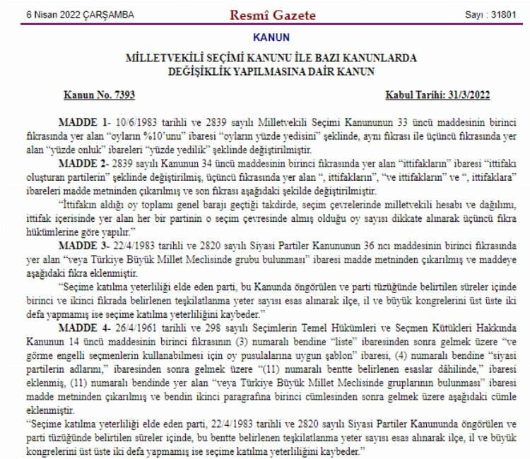Resmi Gazete'nin bugünkü sayısında yayımlanan "Milletvekili Seçimi Kanunu ile Bazı Kanunlarda Değişiklik Yapılmasına Dair Kanun"a göre seçimlerde yüzde 10 olarak uygulanan ülke seçim barajı yüzde 7'ye indirildi.