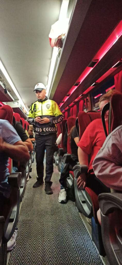 Otobüs şoförleri ve yolculara emniyet kemerinin önemi ve seyahat boyunca emniyet kemerinin takılı olması konusu bilgilendirmeler yapıldı. Hız ve yorgun araç kullanmama konularında sürücülerin daha duyarlı hale gelmeleri sağlandı.