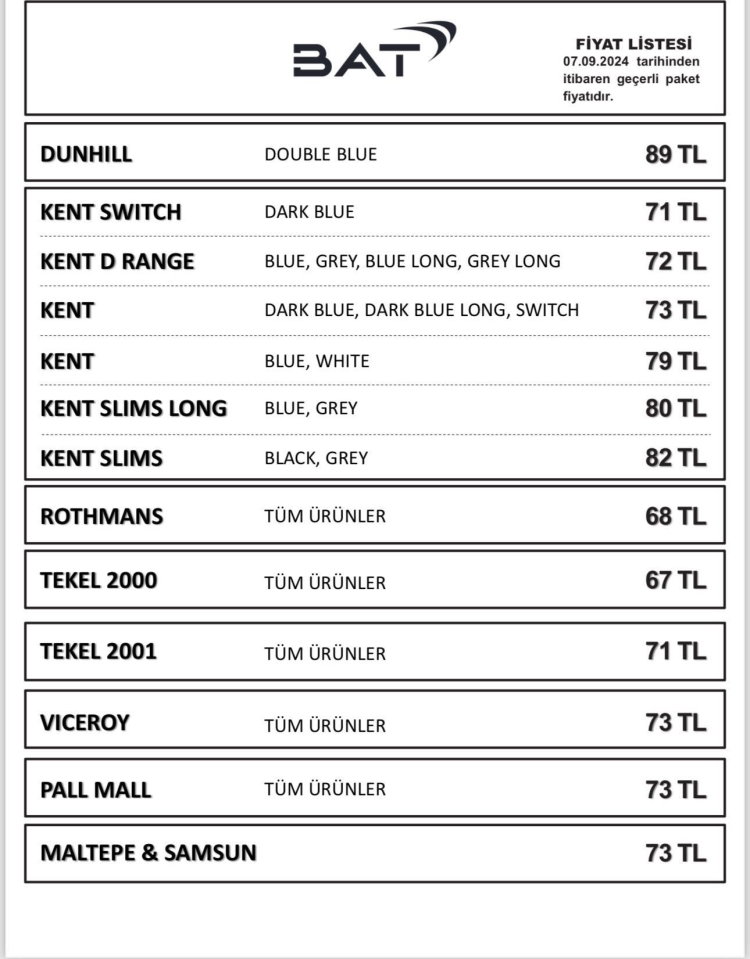 Güncellenen fiyat listesine göre, BAT sigara grubunun en pahalı sigarası 89 TL'ye, en ucuz sigarası ise 68 TL'ye yükseldi.