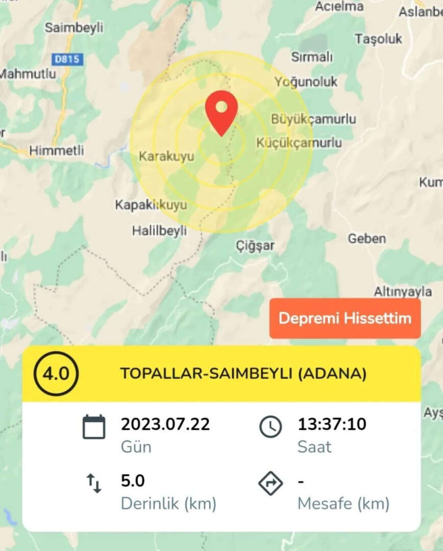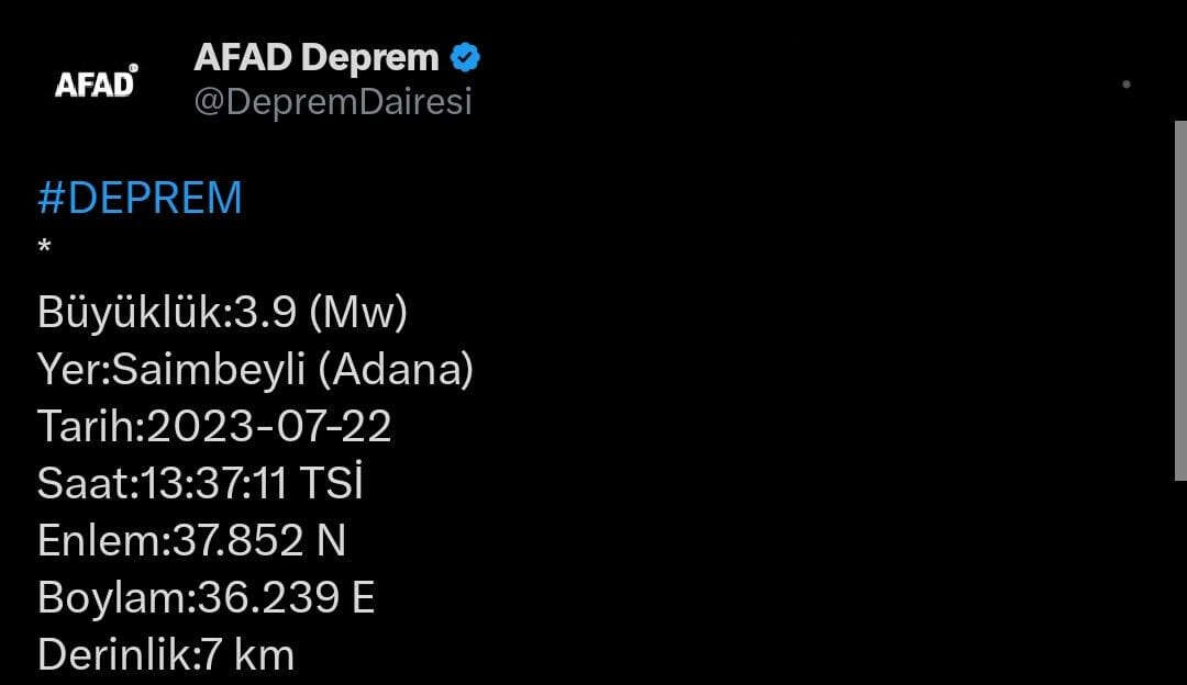 Afet ve Acil Durum Yönetimi Başkanlığı (AFAD) Deprem Dairesi, Adana'nın Saimbeyli ilçesinde bugün saat 13.37 sıralarında 3.9 büyüklüğünde ve yerin 7 kilometre derinliğinde bir deprem meydana geldiğini duyurdu.