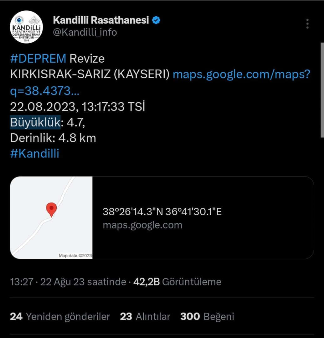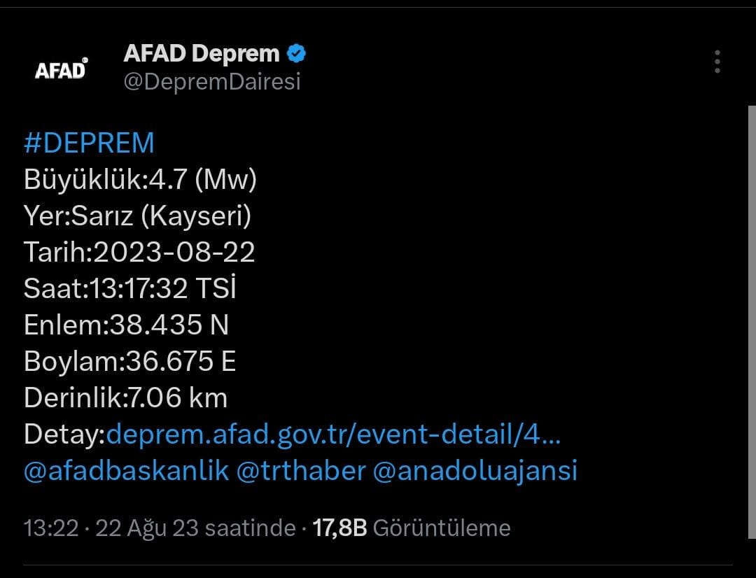 Afet ve Acil Durum Yönetimi Başkanlığı (AFAD) verilerine göre; Kayseri'nin Sarız ilçesinde, saat 13.17 sularında, 4.7 büyüklüğünde ve yerin yaklaşık 7,6 kilometre derinliğinde yaşandığını bildirdi.