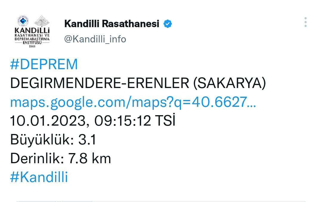Kandilli Rasthanesi’nin Twitter’dan yaptığı paylaşıma göre Sakarya’nın Değirmendere ilçesinde de 3.1 büyüklüğünde bir deprem meydana geldi. Değirmendere’de meydana gelen deprem yerin 7.8 kilometre derinliğinde gerçekleşti.