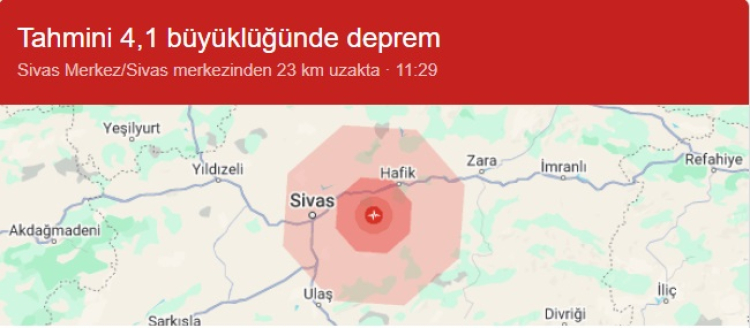 Son dakika haberine göre merkez üssü Sivas'ın Hafik ilçesi olan 4.1 şiddetinde deprem meydana geldi. Yaşanan sarsıntı paniğe yol açarken çevre illerden de hissedildi. Konuyla ilgili henüz resmi bir açıklama gelmedi.
