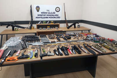 “6136 Sayılı Ateşli Silahlar ve Bıçaklar ile Diğer Aletler Hakkında Kanun kapsamında yapımı ve satışı yasak olan silah, bıçak, kama, kılıç, muşta vb. aletlerin sosyal medya ve internet üzerinden satışının ve temininin engellenmesine yönelik İl Emniyet Müdürlüğü Asayiş Şube Müdürlüğü ve Siber Suçlarla Mücadele Şube Müdürlüğü çalışma yürüttü. Yapılan çalışmalar neticesinde Niğde’de sosyal medya üzerinden söz konusu yasadışı materyallerin satışını yaptığı tespit edilen S.E. isimli şahsın ikamet ve işyerinde aramalar yapıldı. Yapılan aramalarda; “1 adet ruhsatsız tabanca, 2 adet kurusıkı tabanca, 4 adet ruhsatsız tüfek, 116 adet av tüfeği fişeği, 139 adet kurusıkı fişeği, 117 adet muşta, 13 adet biber gazı, 4 adet metal kelepçe, 6 adet teleskopik jop, 7 adet elektroşok cihazı, 2 adet kılıç, 5 adet balta, 2 adet ustura, 317 adet değişik ebat ve özelliklerde bıçak olmak üzere toplam 747 adet materyal ele geçirildi. Gözaltına alınan şüpheli şahıs hakkında gerekli adli ve idari işlem yapıldı. Niğde İl Emniyet Müdürlüğü’nden yapılan yazılı açıklamada; “İlimiz genelinde vatandaşların can ve mal güvenliğinin sağlanması konusunda tedbirlerimiz ve meydana gelen olayların aydınlatılması ve faillerin yakalanmasına yönelik çalışmalarımız hassasiyetle sürdürülmektedir”
