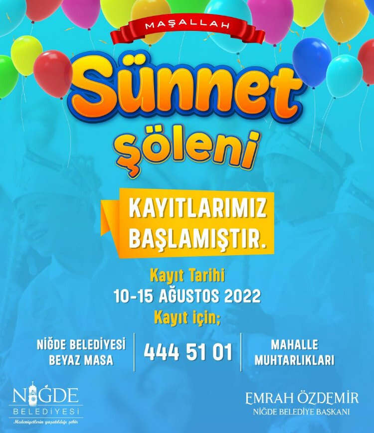 Niğde Belediyesi tarafından düzenlenen sünnet organizasyonuna başvurular Niğde Belediyesi ve mahalle muhtarlıklarından yapılabilecek. Başvurular 10-15 Ağustos 2022 tarihleri arasında yapılacak.