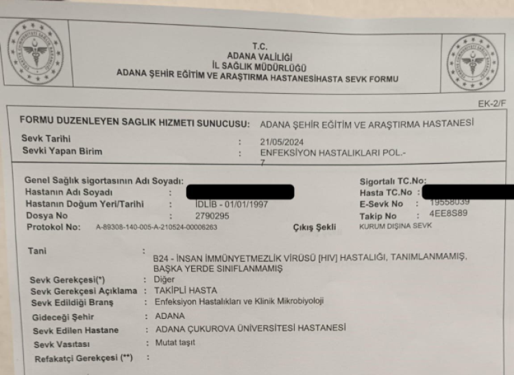 Adana'da eğitim araştırma hastanesinde 1997 doğumlu Suriyeli trans M.E.'ye yapılan HIV testi pozitif çıktı. Sosyal medyada da paylaşılan rapor, kısa sürede kentte büyük paniğe neden oldu.