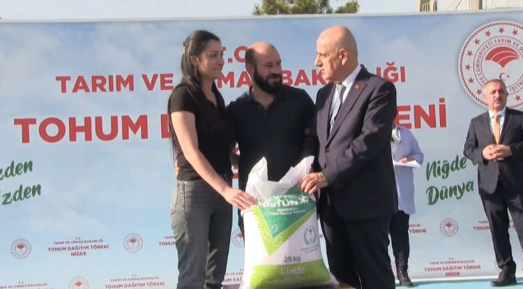 Tarım ve Orman Bakanı Vahit Kirişci, Niğde'de çiftçilere kuru fasulye tohumu dağıttı.