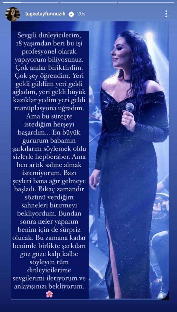 Yıllardır bu işi yaptığını ve zorluklar yaşadığını dile getiren güzel şarkıcı Tuğçe Tayfur sosyal medya hesabında sevenlerine “ Sevgili dinleyicilerim, 18 yaşımdan beri bu işi profesyonel olarak yapıyorum biliyorsunuz. Çok anılar biriktirdim. Çok şey öğrendim. Yeri geldi güldüm yeri geldi ağladım, yeri geldi büyük kazıklar yedim yeri geldi manüplasyona uğradım. Ama bu süreçte istediğim her şeyi başardım. En büyük gururum babamın şarkılarını söylemek oldu sizlerle hep beraber. Ama ben artık sahne almak istemiyorum. Bazı şeyler bana ağır gelmeye başladı. Birkaç zamandır sözünü verdiğim sahneleri bitirmeyi bekliyordum. Bundan sonra neler yaparım benim için de sürpriz olacak. Bu zamana kadar benimle birlikte şarkıları göz göze kalp kalbe söyleyen tüm dinleyenlerime sevgilerimi iletiyorum ve anlayışınızı bekliyorum.” Dedi.