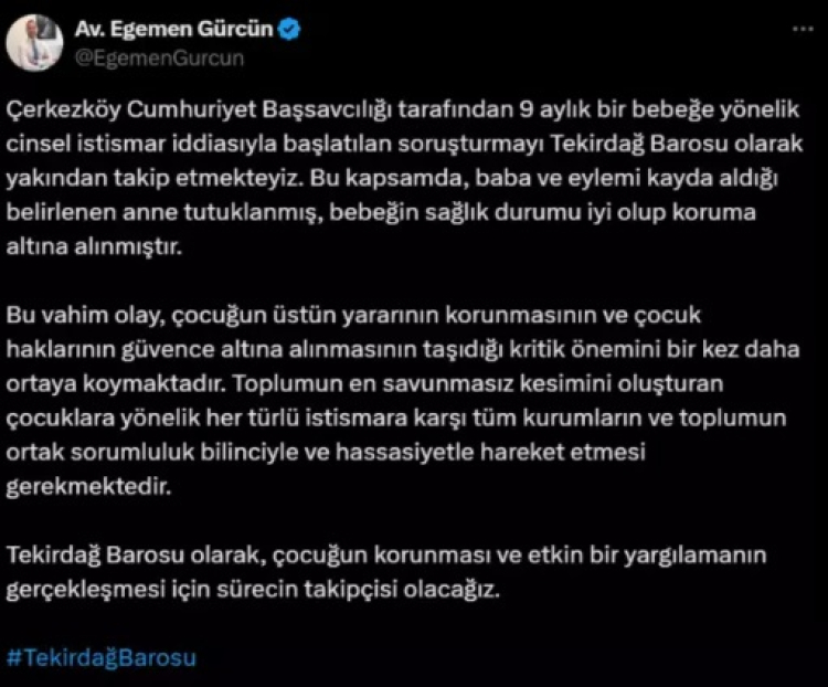 Türkiye'nin gündemine oturan ve toplumda infial yaratan olaya ilişkin bugün yeni bir gelişme yaşandı. Tekirdağ Barosu Başkanı Egemen Gürcün sosyal medya platformu X hesabından yaptığı paylaşımda tutuklanan babanın intihar ettiğini aktardı. Gürcün paylaşımında, "Çerkezköy Cumhuriyet Başsavcılığı tarafından 9 aylık bebeğin cinsel istismar edildiği iddiasıyla başlatılan soruşturmada tutuklanan babanın cezaevinde intihar ettiği bilgisi ulaştı. Konuyu hassasiyetle takip ediyoruz" ifadelerine yer verdi.