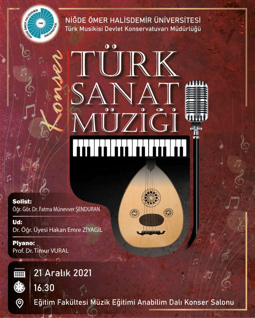 "Türk Sanat Müziği Konseri" Tarih: 21 Aralık 2021 Salı Saat: 16.30 Yer: Eğitim Fakültesi Müzik Eğitimi Anabilim Dalı Konser Salonunda yapılacak.