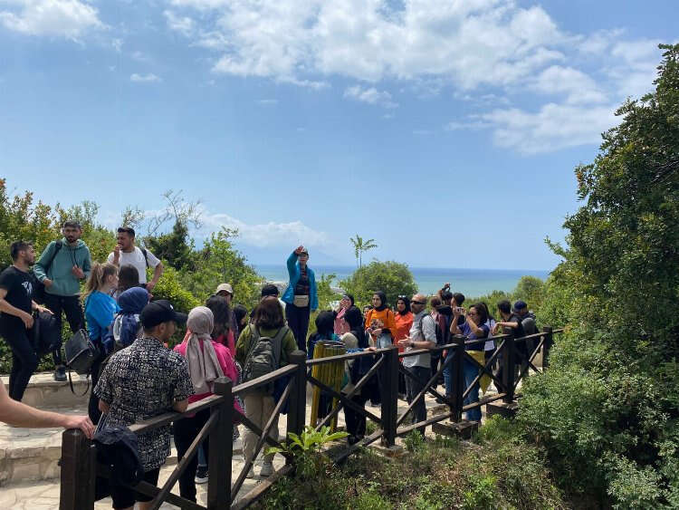 Prof. Dr. Türkan Bayer Altın’ın, Asi Deltası gelişim evrelerini, tarih öncesi kıyı yerleşmelerinin yok olma ve Titus Tünellerinin yapılma nedenlerini yerinde anlattığı ders kapsamında ayrıca Amanos Dağları’ndaki toprak kaymalarının, iklimin, topografik faktörlerin bitki dağılışı üzerindeki etkilerine değinildi ve bitkilerin nasıl saklanması (bitki piresleme) gerektiği de öğrencilere aktarıldı.