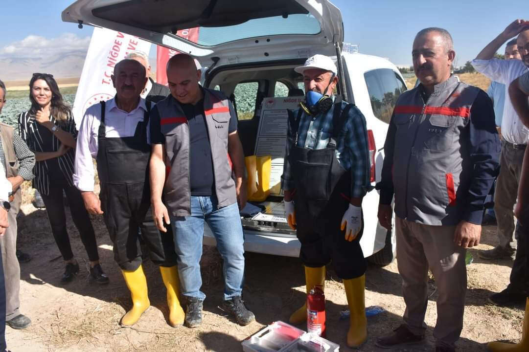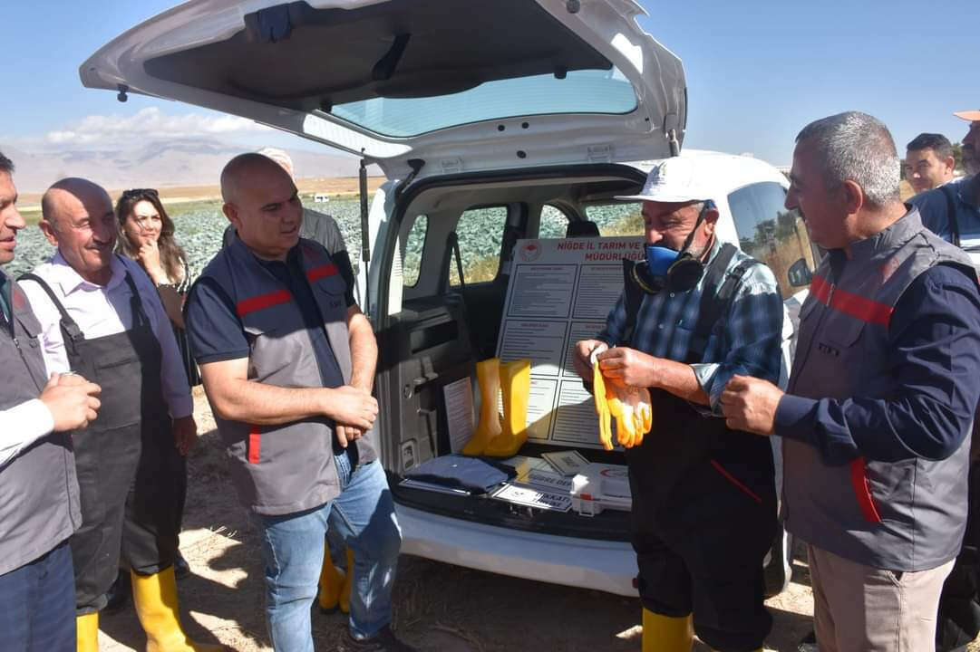 Niğde İl Tarım Orman Müdürlüğü tarafından yürütülmekte olan çevre, insan ve hayvan sağlığına zarar vermeyen bir tarımsal üretim ve tarımda izlenebilirlik ve sürdürebilirlik ile gıda güvenliğinin sağlanması için yürütülen İyi Tarım Uygulamalarının Yaygınlaştırılması ve Kontrolü Projesi kapsamında yer alan 34 üreticiye Niğde Valisi Mustafa Koç tarafından bitki koruma ürünleri uygulamalarında kullanacakları koruyucu malzemeler verildi.