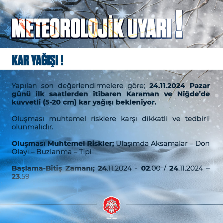 Yapılan son değerlendirmelere göre; 24.11.2024 Pazar günü ilk saatlerden itibaren Karaman ve Niğde'de kuvvetli (5-20cm) kar yağışı bekleniyor. Oluşması muhtemel ulaşım aksamaları, don olayı, buzlanma ve tipi gibi risklere karşı dikkatli ve tedbirli olunmalıdır.