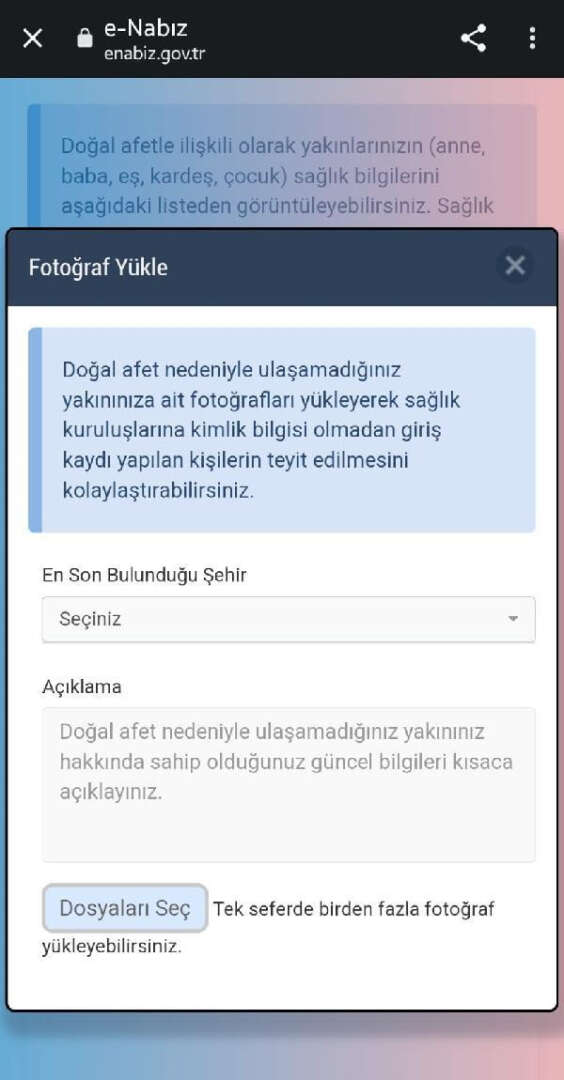 Yakınlarının hangi hastanede olduğunu bulamayan vatandaşlar için e-Nabız üzerinde aktifleştirilen "Doğal Afet Bilgilendirme" sekmesine, "fotoğrafla sorgulama" özelliği eklendi.