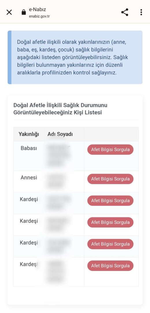 "Bu alandaki bilgiler kesin bilgi niteliğinde olmayıp sağlık kuruluşlarından temin edilerek paylaşılan bilgilerdir" uyarısı da yer alan metin onaylandıktan sonra depremle ilişkili birinci ve ikinci derece yakınların (anne, baba, kardeş, çocuk, eş) yer aldığı kişi listesi sıralanıyor.