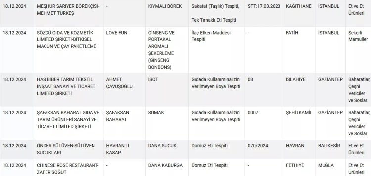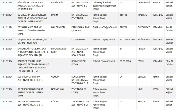 Bakanlık tarafından 18 Aralık'ta güncellenen son listede aynı zamanda birçok zeytinyağı markasının taklit ve tağşiş yaptığı belirlendi. Bazı börek markalarının iç harcında kanatlı taşlığı, sakatat ve tek tırnaklı etlerinin kullanıldığı belirlenirken Havranlı Kasap ve Sütüveren Sucukları markasında dana eti ibaresi olmasına rağmen domuz eti kullanıldığı açıklandı.