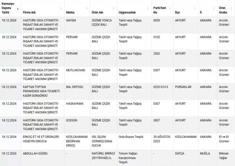 Tarım ve Orman Bakanlığı, taklit ve tağşiş yapan firmaları deşifre etmeye devam ediyor. İnsan sağlığa tehdit oluşturan ürünler ve firmaların isimleri, Bakanlığın resmi internet sitesinde tek tek deşifre ediliyor. BAkanlık tarafından market raflarından numunesi alınan 11 bal sahte çıkarken bir vatandaşların talebi üzerine inceleme yapılan kasapta satılan dana sucuk ve ve bir Çin restoranında satılan kaburgada, domuz eti tespit edildi.